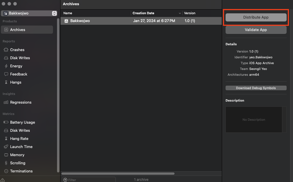 Archives를 완료하면 위와 같은 창이 나오는데, 본인의 앱을 선택하고 Distribute App을 클릭한다.