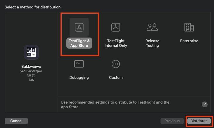 TestFlight & App Store를 선택하고 Distribute를 클릭한다.