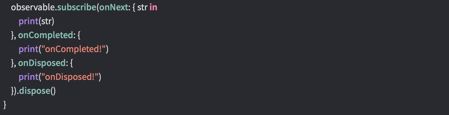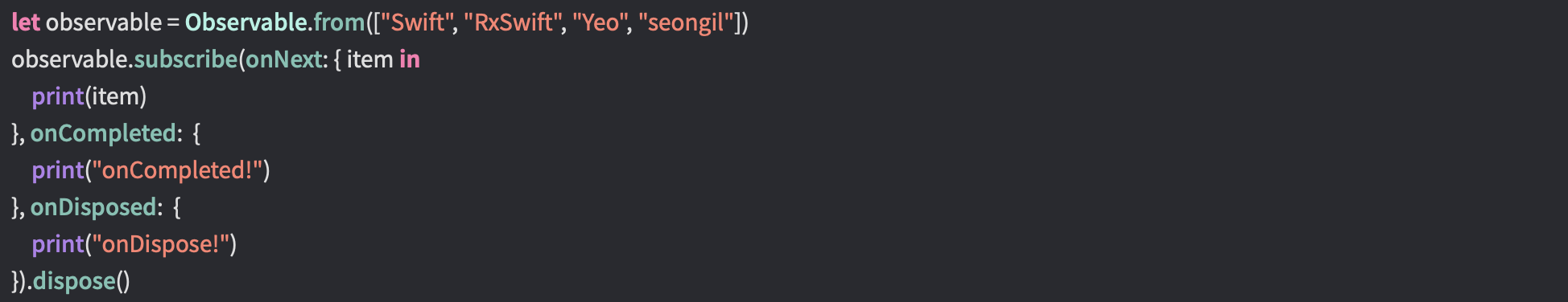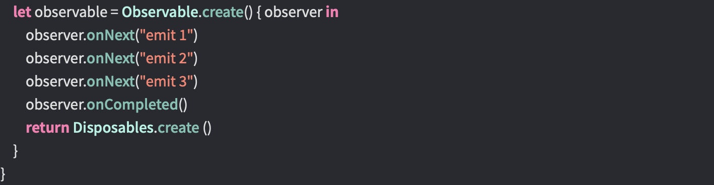 트레일링 클로저를 이용해서 인자로 받은 observer에게 어느 시점에 onNext를 실행할지, 어느 시점에 onCompleted 할지, 어느 시점에 onError를 방출할지를 개발자가 직접 클로저 안에서 호출할 수 있다.