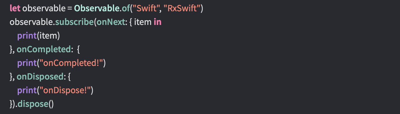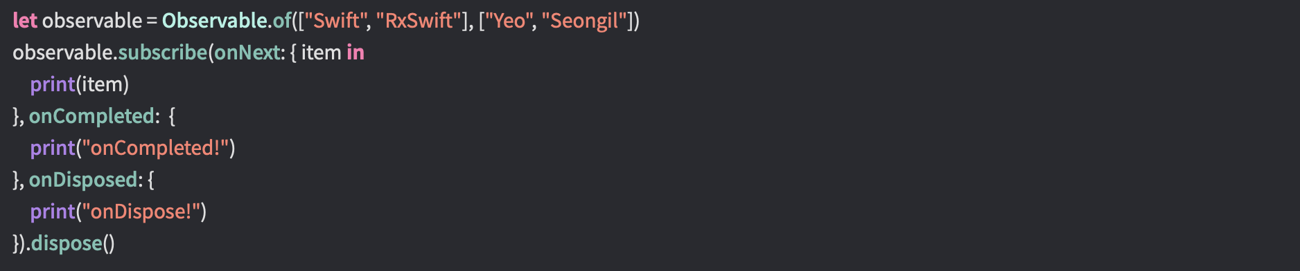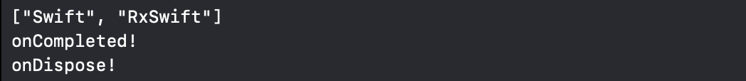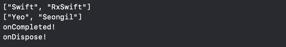 just 연산자를 통해 "Swift", "RxSwift"라는 두 개의 String을 인자로 넘겨주었다. just 연산자였으면 에러가 발생했겠지만, of는 한 개 이상의 item을 emit하므로 에러가 발생하지 않는다. 실행 결과를 보자.