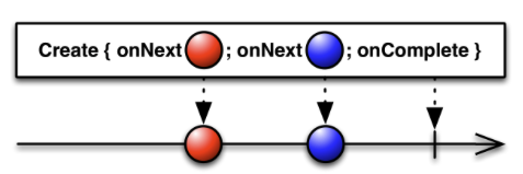 ➡️ Create 연산자를 사용하면 처음부터 Observable을 만들 수 있다. 이 연산자를 매개변수로 Observable를 받아들이는 함수를 전달한다. onNext, onError, onComplete 메소드를 적절히 Observable를 호출하여 Observable로 동작하도록 이 함수를 작성한다.