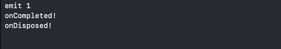 아래의 그림처럼 emit 1만 출력하고 onCompleted!, onDisposed!가 출력 됨을 볼 수 있다.