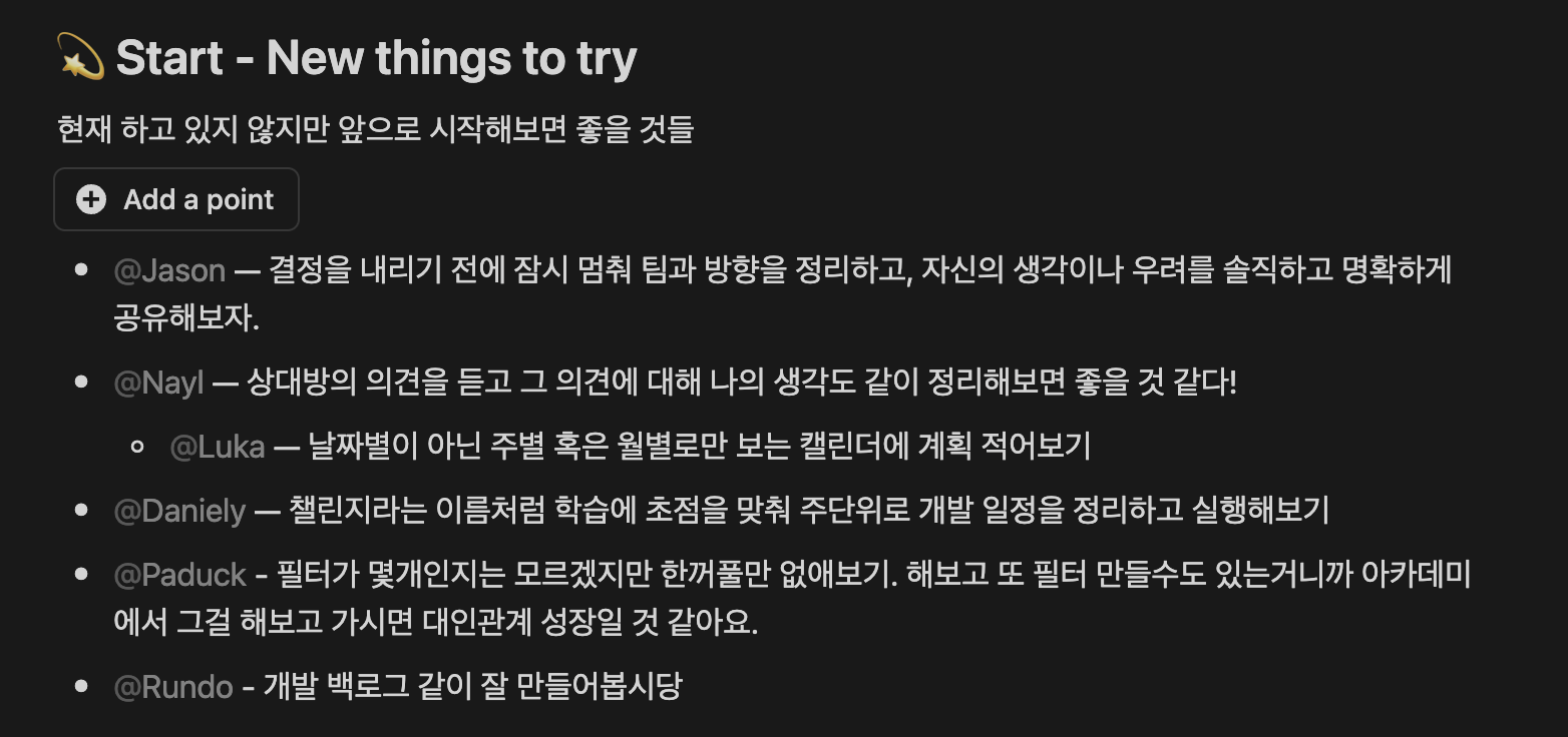 가장 와닿았던 피드백은 의사결정을 내리기 전에 잠시 멈춰 팀과 함께 방향을 정리하는 것이었다. 나는 조급한 성향 때문에 때로는 바로 실행부터 하는 경우가 많았는데, 앞으로는 결정 전에 내 생각이나 우려를 솔직하게 공유하면서 팀과 충분히 의견을 나누고 싶다.