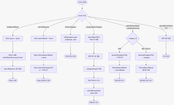 하지만 실제로 도식화를 진행하면서 이런 생각은 빠르게 바뀌었습니다. 도식화를 위해 코드를 처음부터 다시 읽고, 흐름을 따라가며 구조를 정리하는 과정에서 발견하지 못했던 부분들과 개선이 필요한 지점들이 눈에 띄기 시작했기 때문입니다. 예를 들어, state.searchSuggestion.searchText = query와 같은 코드가 있습니다. 이 부분은 기능적으로는 문제가 없었지만, 도식화 과정에서 다시 보니 구조적으로 꽤 특이한 형태라는 것을 알게 되었습니다. 일반적으로 TCA에서는 부모 State가 자식 State 내부 값을 직접 수정하는 방식은 안티패턴에 가깝습니다. 자식 State는 해당 도메인의 Action과 Reducer를 통해 스스로 상태를 변경하는 것이 TCA가 지향하는 구조이기 때문입니다. 평소 기능 구현에 집중할 때는 크게 의식하지 못했던 부분이었지만, 흐름을 그림으로 풀어내려다 보니 이러한 개선점을 발견하게 되었습니다.