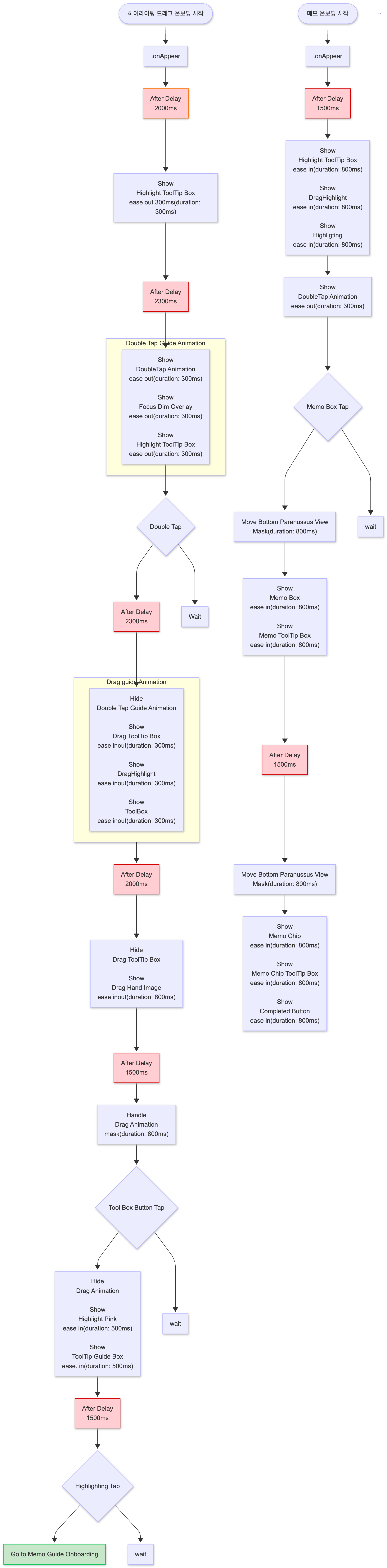 플로우차트를 그릴 때 온보딩 전체 흐름을 한눈에 파악할 수 있는지를 가장 중요하게 생각했습니다. 특히 각 애니메이션이 몇 초 동안 실행되는지, 그리고 그 애니메이션이 끝난 뒤 몇 초 후 어떤 이벤트가 발생하는지처럼 시간 흐름에 따른 변화를 직관적으로 이해할 수 있도록 구성하려고 했습니다. 사용자의 탭이나 더블 탭 같은 인터랙션에 따른 분기 처리와, After Delay로 이어지는 시간 흐름에 따른 애니메이션 전개를 함께 표현하는데 집중했습니다.
