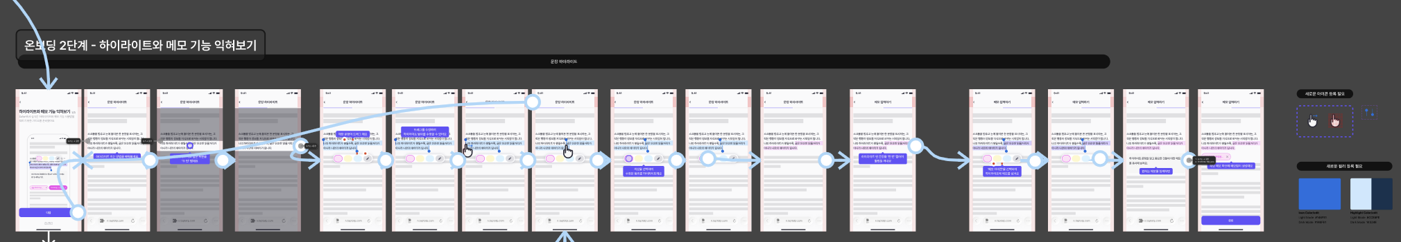 특히 하이라이트 온보딩은 단순한 설정 화면이 아니라 실제 사용 흐름을 따라가며 보여주는 인터랙션 중심으로 구성되어 있습니다. 두 번 탭 → 드래그 → 색상 선택 → 메모 추가까지, 사용자가 자연스럽게 기능을 이해할 수 있도록 꽤 많은 애니메이션과 뷰 이동이 포함돼 있습니다.