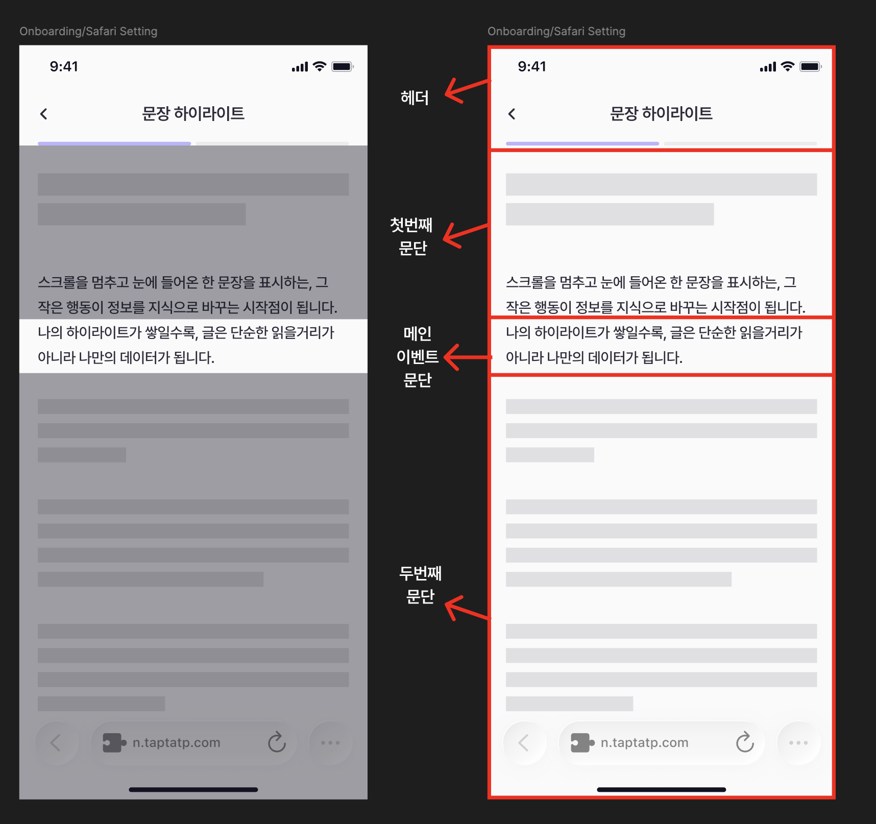 탭탭은 사파리 익스텐션을 기반으로 동작하는 서비스입니다. 그래서 사용자가 처음 앱을 접했을 때, 사파리 확장 프로그램 설정 방법이나 문장을 하이라이트하는 방식처럼 다소 낯설 수 있는 기능들을 온보딩에서 가이딩을 통해 안내하고 있습니다.