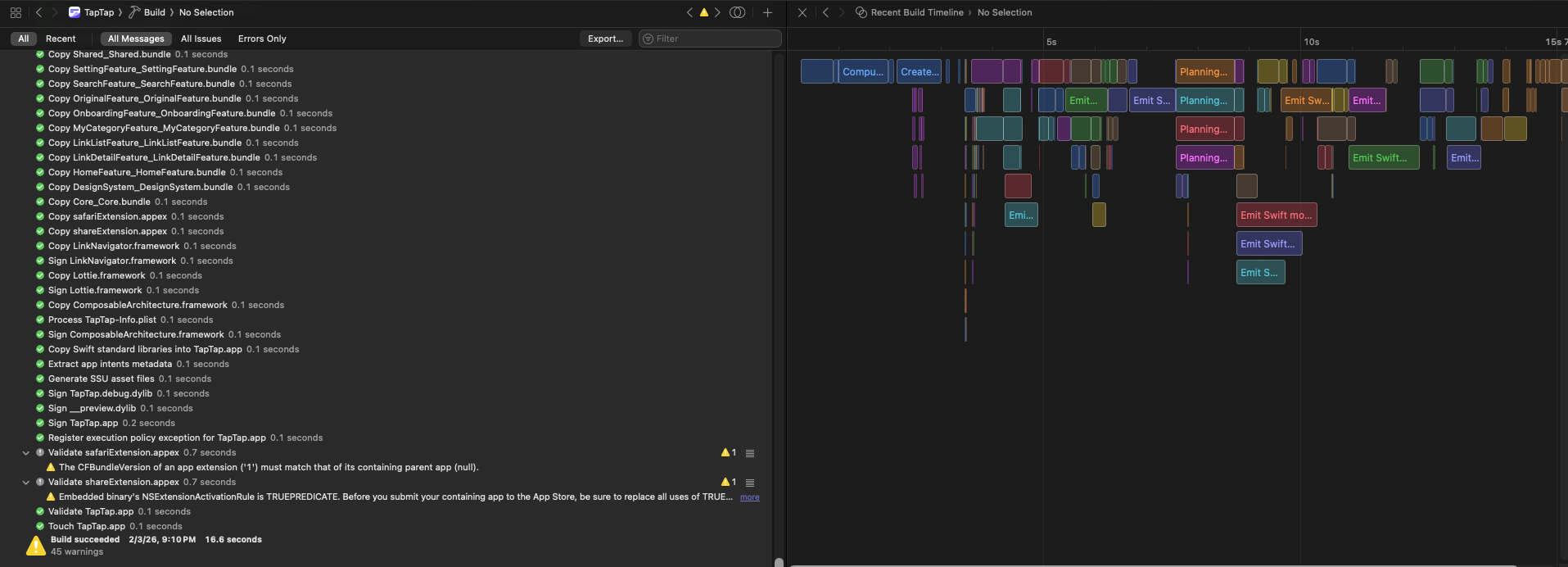 여기서 tuist cache를 활용해 변경이 적은 모듈들을 미리 빌드하여 캐시로 관리한다면, 빌드 시간을 더욱 단축할 수 있을 것으로 기대합니다.