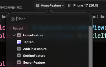 더 나아가 'tuist generate 모듈명' 명령어를 통해 특정 피처 모듈만 별도로 분리하여 작업하는 것도 가능해졌습니다.
