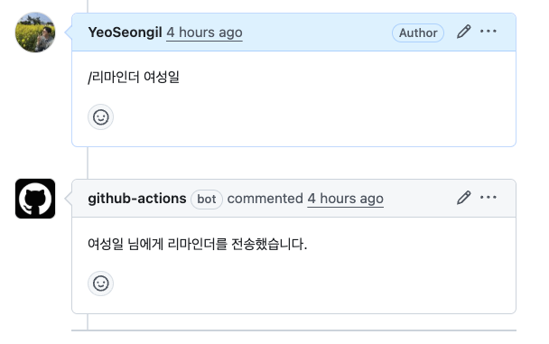 다행히 깃액션에는 PR 댓글 이벤트를 감지하여 워크플로우를 실행할 수 있었어요. 이를 활용해 특정 명령어를 입력하면 리마인더가 전송되도록 구현했습니다.