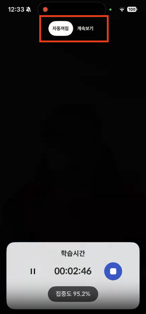 집중력 체크가 시작되면 3초 뒤 화면 밝기가 낮아지도록 설계했습니다. 사용자가 화면을 다시 터치하면 밝아지고, 다시 3초 후 어두워지는 자동 밝기 전환 모드를 구현했습니다.