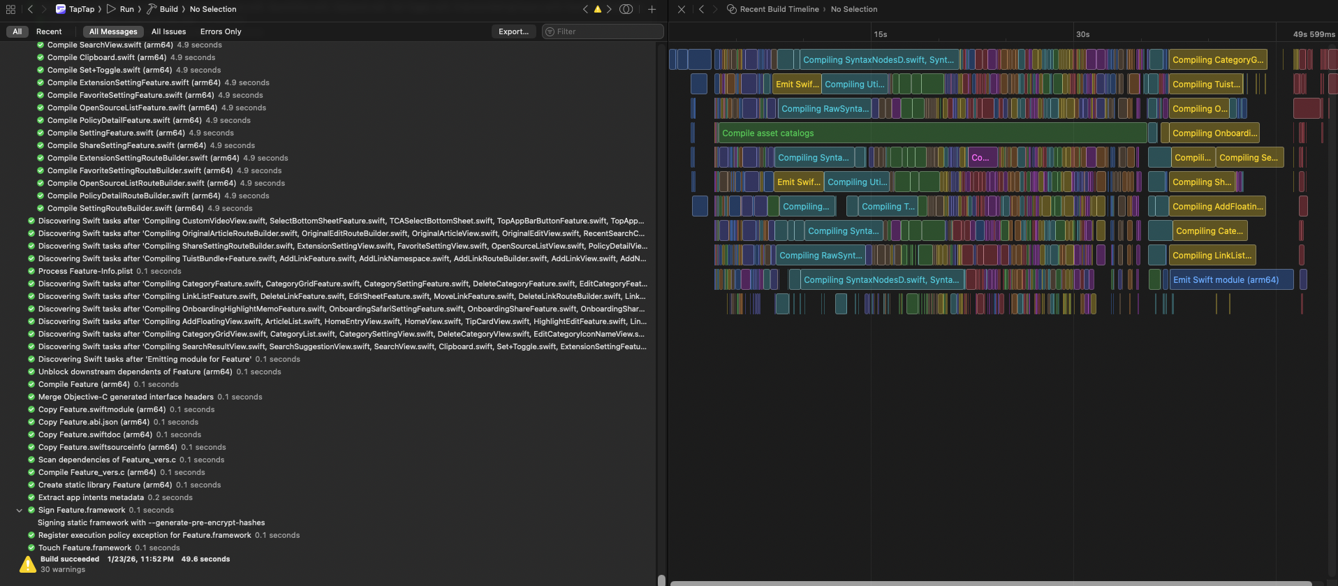 여기서 tuist cache를 활용해 변경이 적은 모듈들을 미리 빌드하여 캐시로 관리한다면, 빌드 시간을 더욱 단축할 수 있을 것으로 기대합니다.