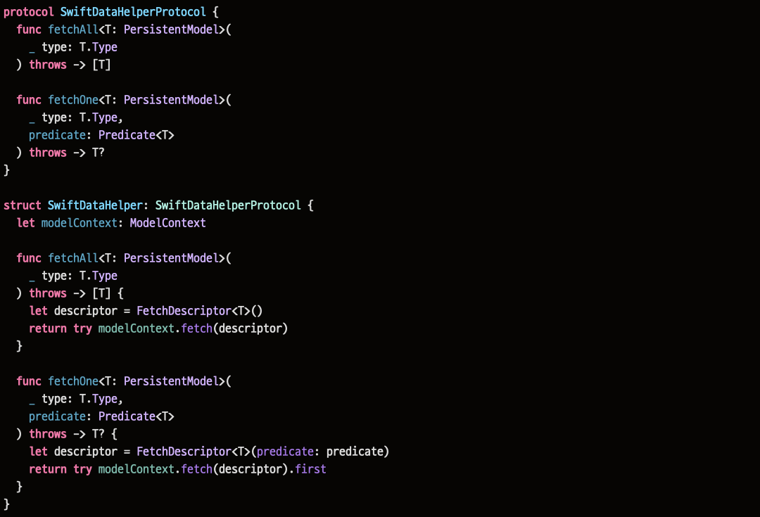처음 리팩토링을 시작했을 때는 헬퍼를 별도의 구조체(SwiftDataHelper)로 분리하는 방향으로 설계를 진행했습니다. 헬퍼를 독립된 타입으로 두면 역할이 더 명확해 보였고, ModelContext를 직접 확장하는 것보다 구조적으로 더 깔끔해 보인다는 느낌도 있었습니다.